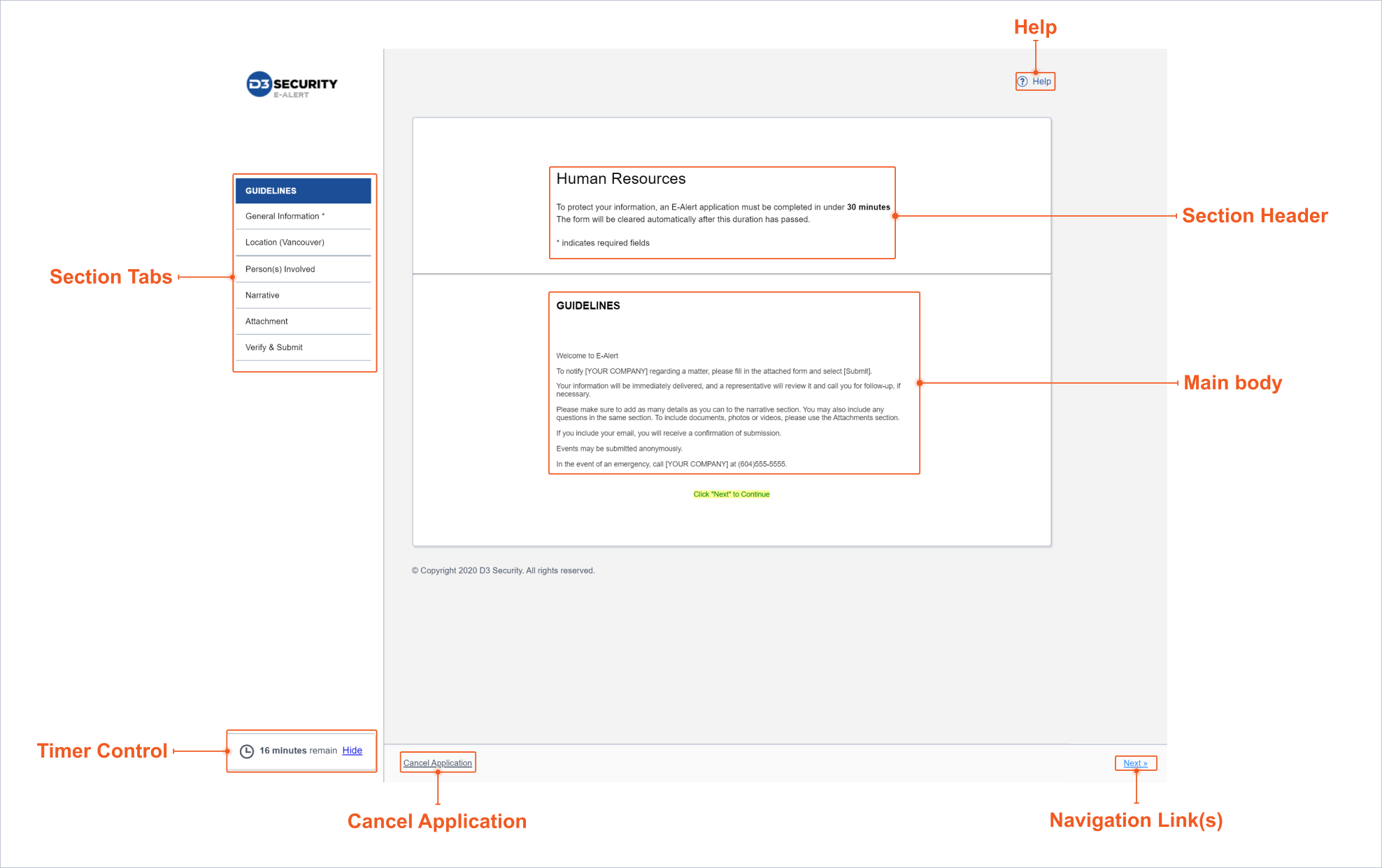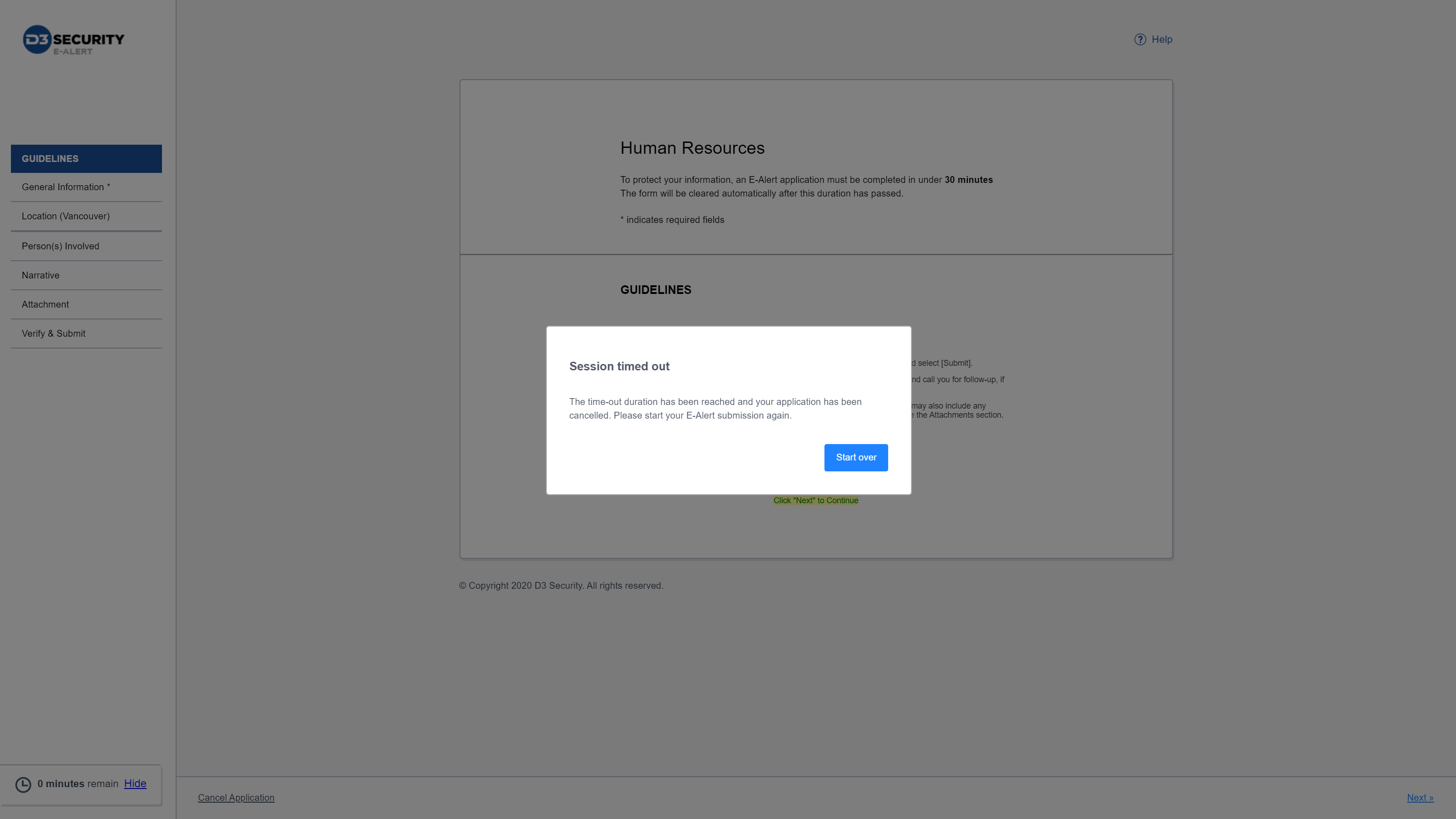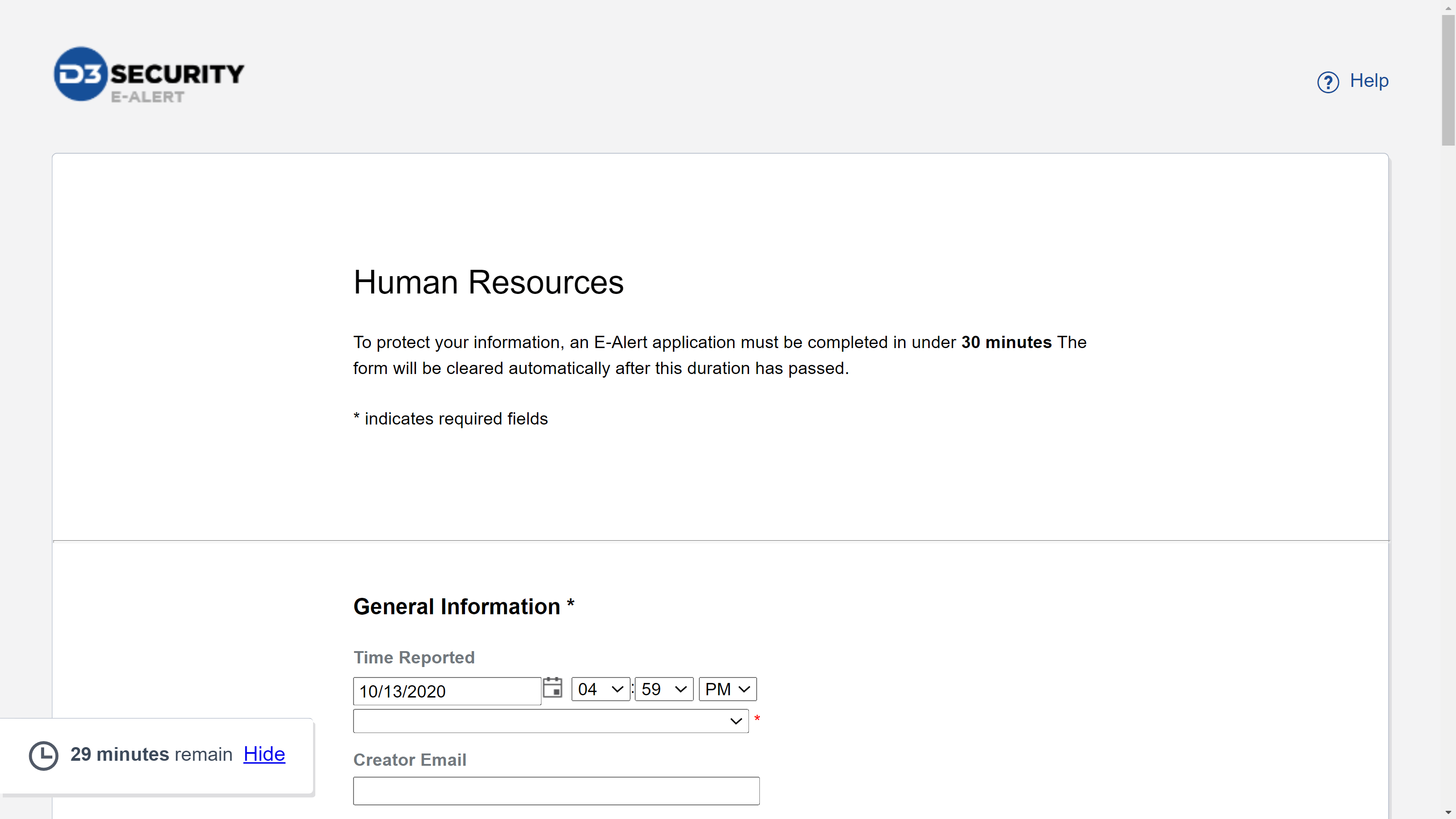 Section Header: The section header contains the name of the E-Alert interface and the time remaining to complete the form.